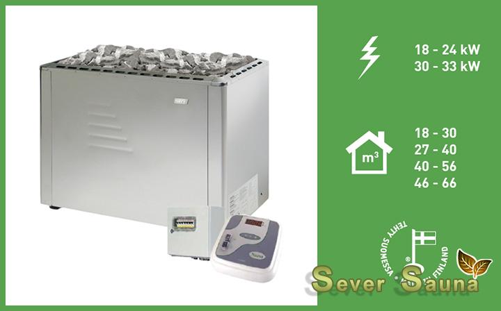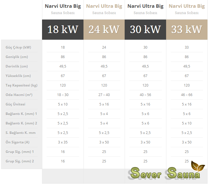 Narvi Ultra Big sauna sobası, Narvi’nin sürekli kullanılan büyük saunalara uyarlanmış, en verimli yer tipi ısıtıcısıdır. Hedef kullanıcılar arasında oteller, eğlence merkezleri, yüzme havuzları ve apartmanların ortak kullanılan saunaları bulunur. Narvi Ultra Big ısıtıcıları, en büyük dört enerji sınıfı için üretilmiştir; 18 kW, 24 kW, 30 kW ve 33 kW. 120 kilogramlık büyük taş kapasitesi sayesinde, büyük saunada bile buhar çıkışı üstündür. Isıtıcının parçaları, paslanmaz ve aşınmaz çelikten yapılmıştır. Narvi Ultra Big ısıtıcıları, ayrı bir kumanda paneli ile kumanda edilir. Kumanda paneli, enerji ve termostat ünitesi ayrı teslim edilir.